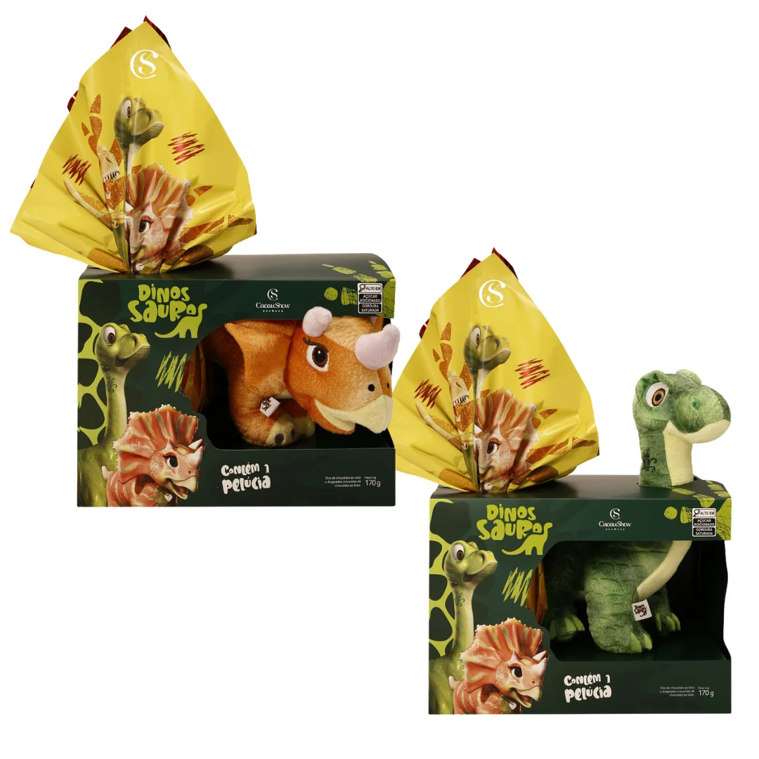 Kit com 02 Ovos de Páscoa + 02 Dinossauros Pelúcia